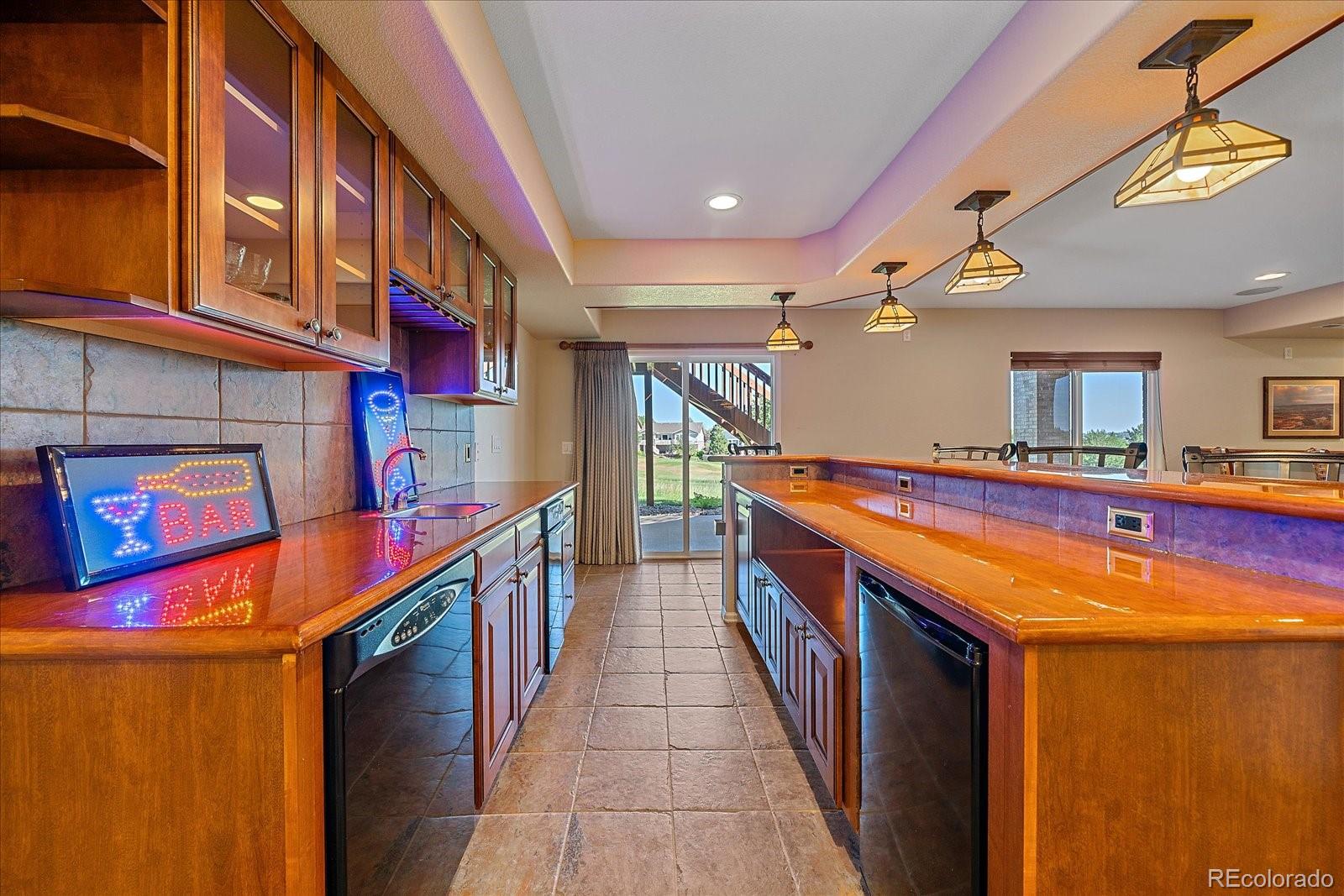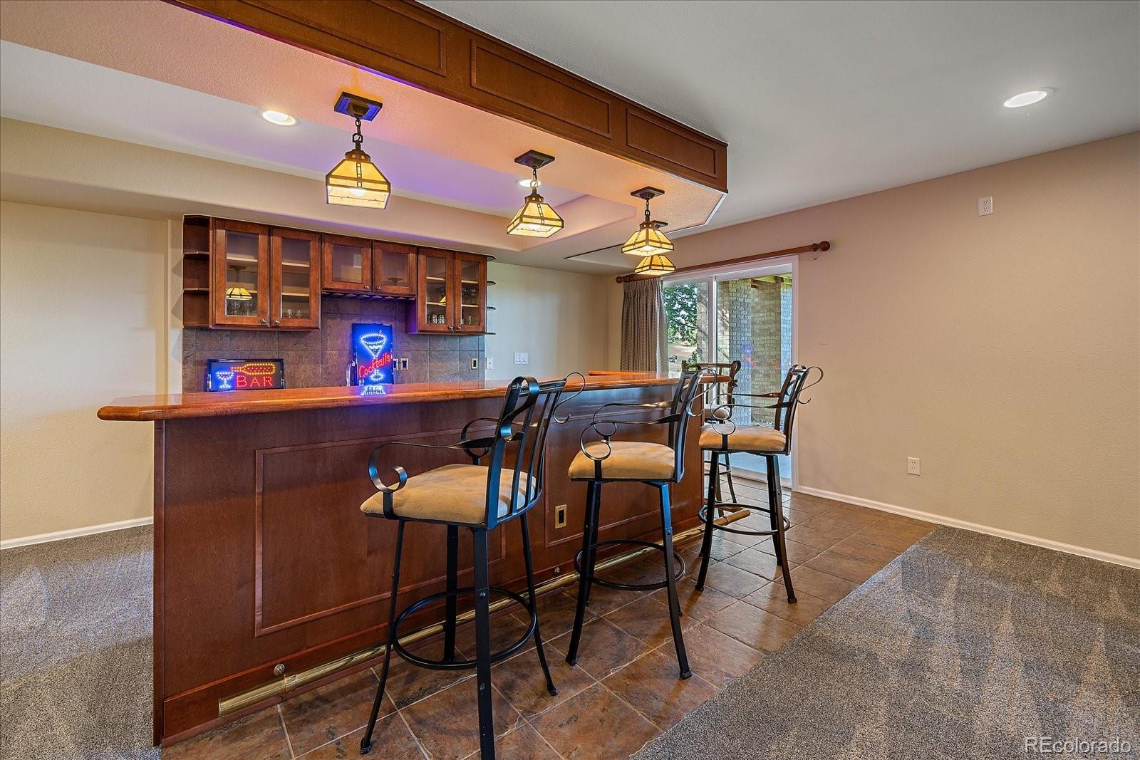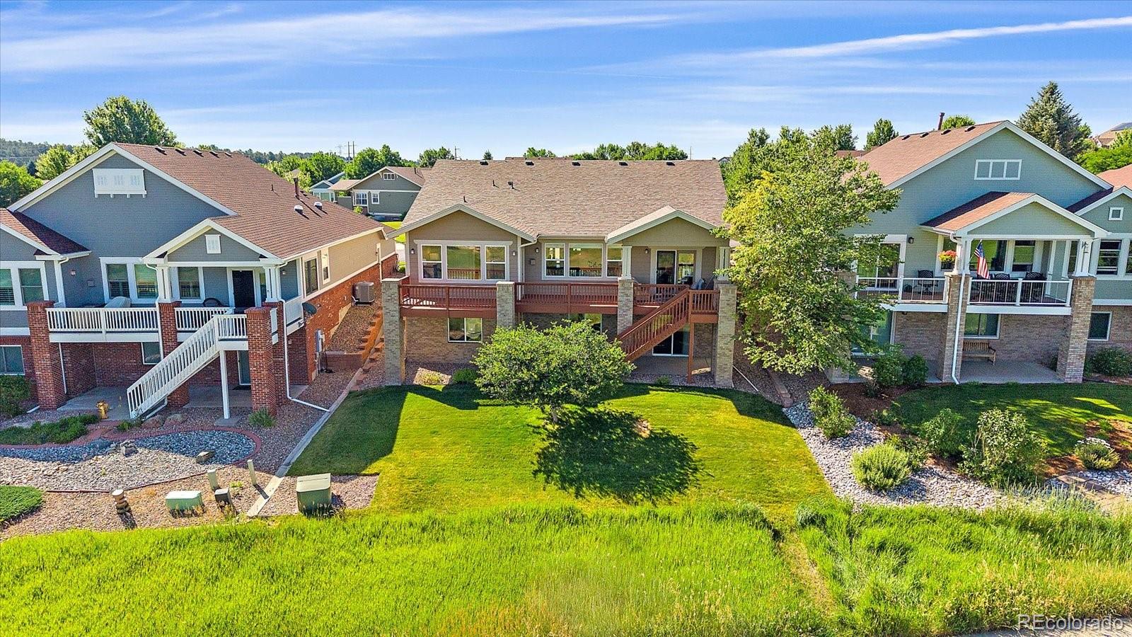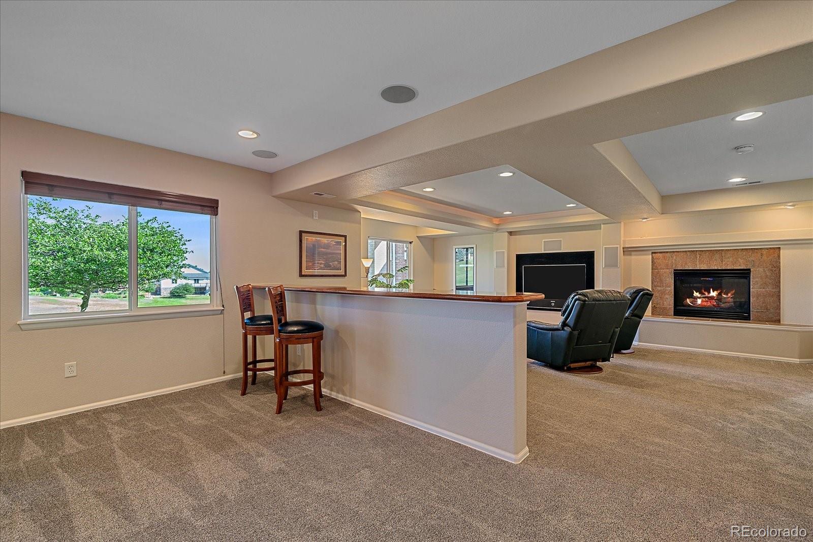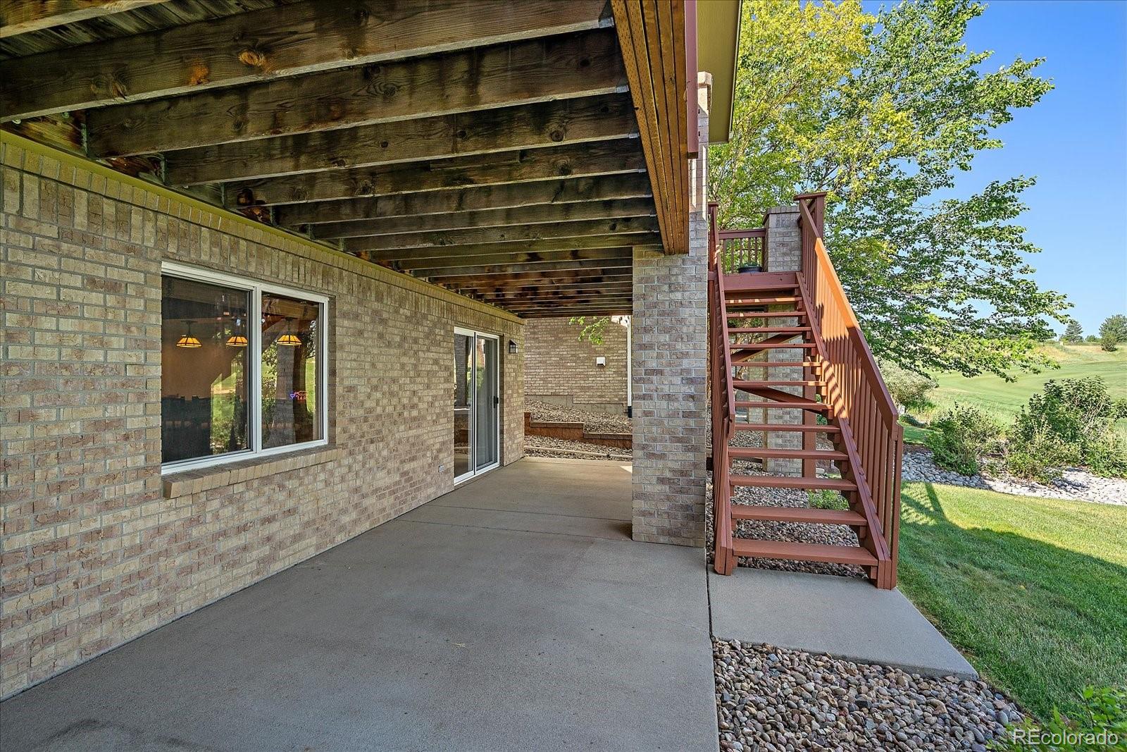 The open-concept main level is ideal for everyday living, while the finished lower level is an entertainer's dream--featuring a full bar with beverage refrigerator, game/poker area, buffet bar, and included surround sound equipment. A spacious guest bedroom and 3/4 bath provide privacy and comfort for visitors. Enjoy stunning sunsets views from the covered back porch or relax on one of the multiple outdoor patios and decks, all while watching golfers tee off just steps away. Retreat to the primary suite, complete with a large walk-in closet, and appreciate the practicality of the oversized 2.5-car garage--perfect for golf carts, storage, or hobbies. Additional highlights include: New Class 4 impact-resistant roof (2024), Rachio smart sprinkler system for effortless lawn care, Located within a premier 45+ golf course community with access to top-tier amenities.