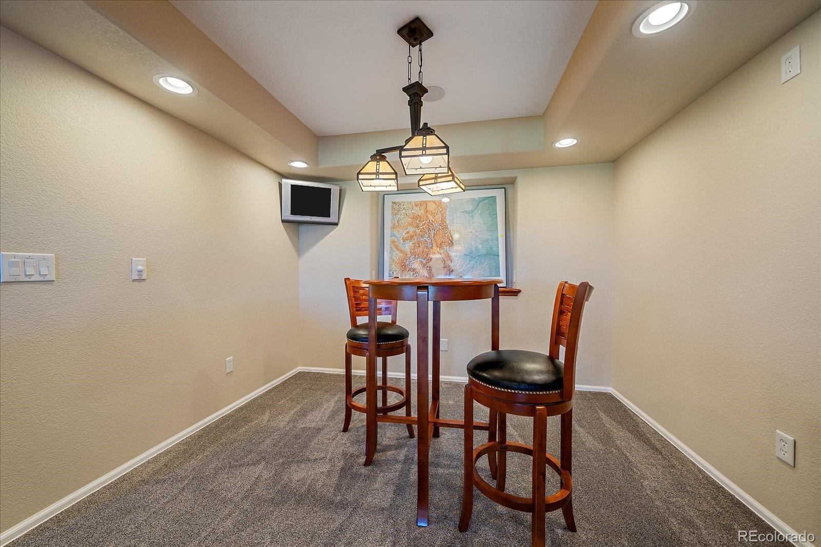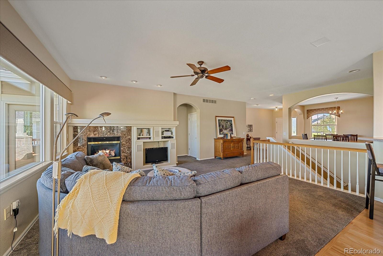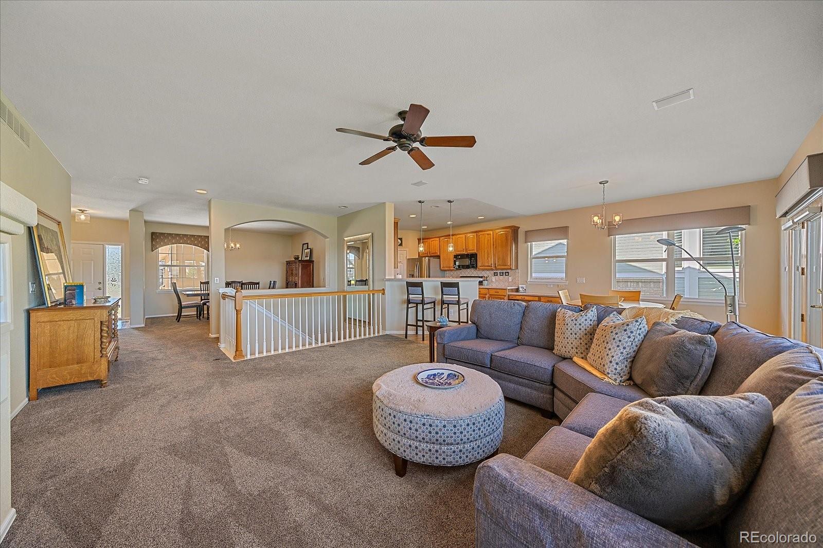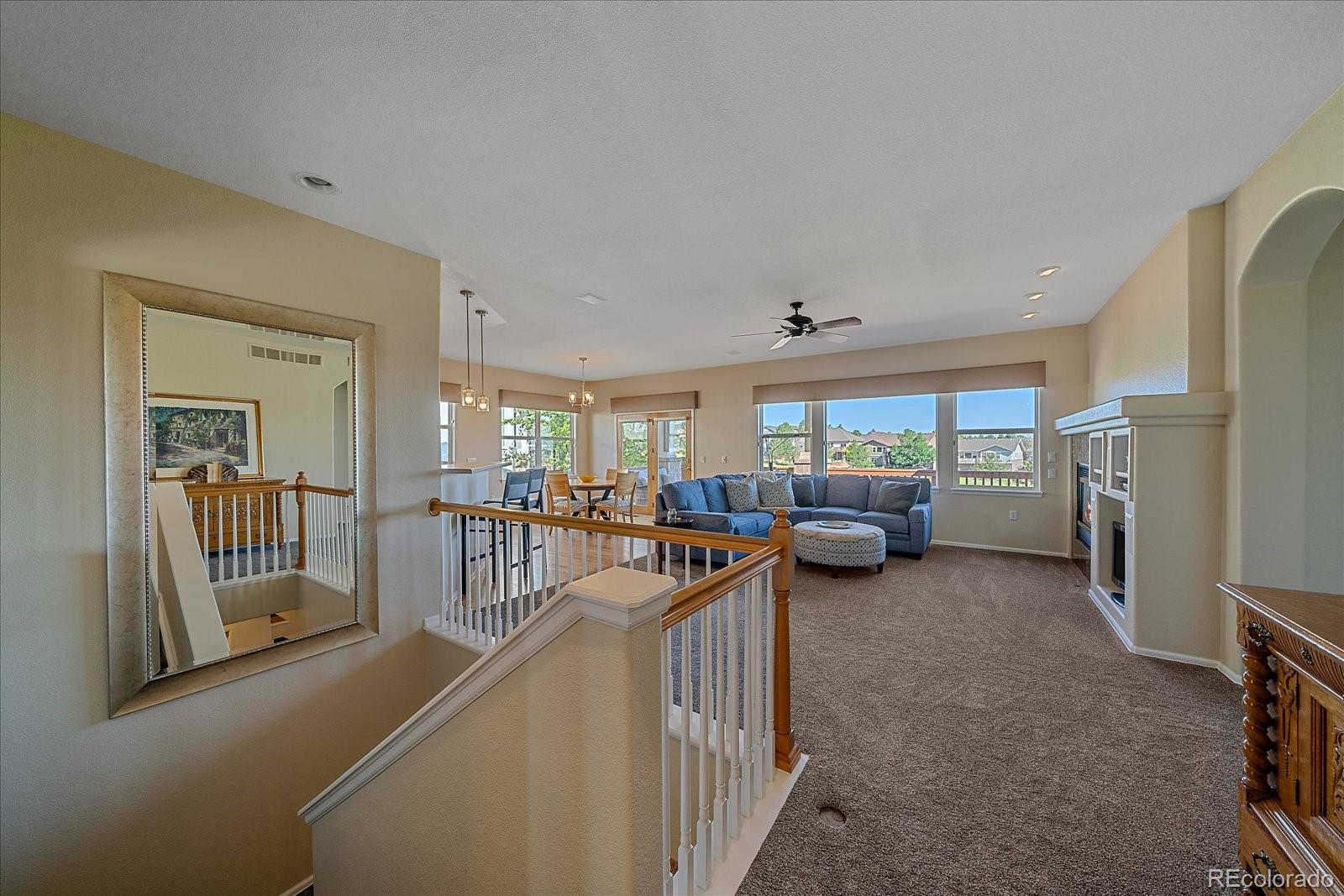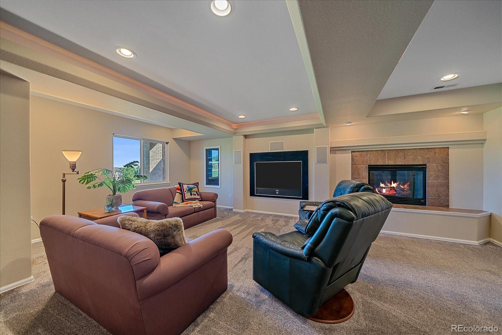 The open-concept main level is ideal for everyday living, while the finished lower level is an entertainer's dream--featuring a full bar with beverage refrigerator, game/poker area, buffet bar, and included surround sound equipment. A spacious guest bedroom and 3/4 bath provide privacy and comfort for visitors. Enjoy stunning sunsets views from the covered back porch or relax on one of the multiple outdoor patios and decks, all while watching golfers tee off just steps away. Retreat to the primary suite, complete with a large walk-in closet, and appreciate the practicality of the oversized 2.5-car garage--perfect for golf carts, storage, or hobbies. Additional highlights include: New Class 4 impact-resistant roof (2024), Rachio smart sprinkler system for effortless lawn care, Located within a premier 45+ golf course community with access to top-tier amenities.