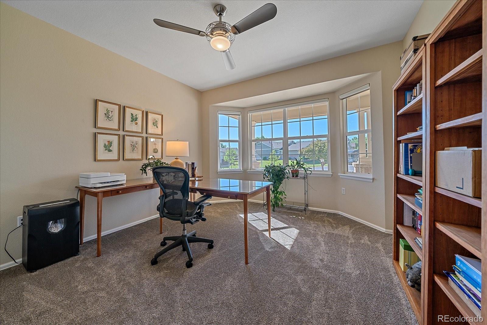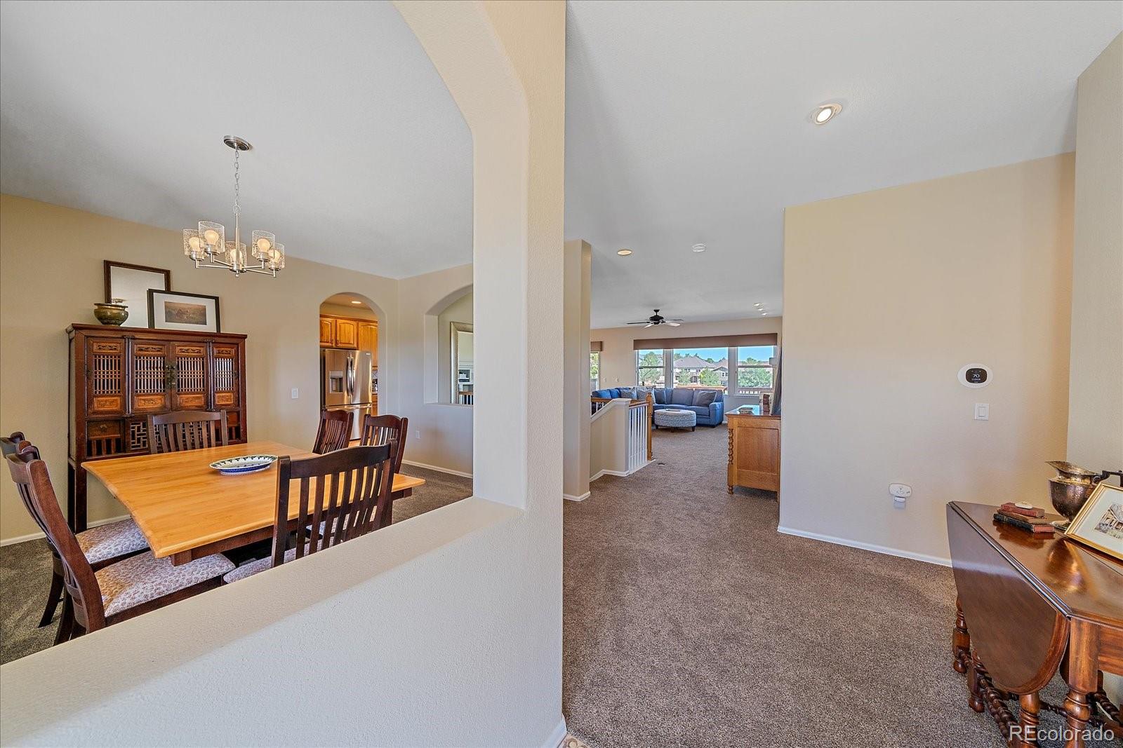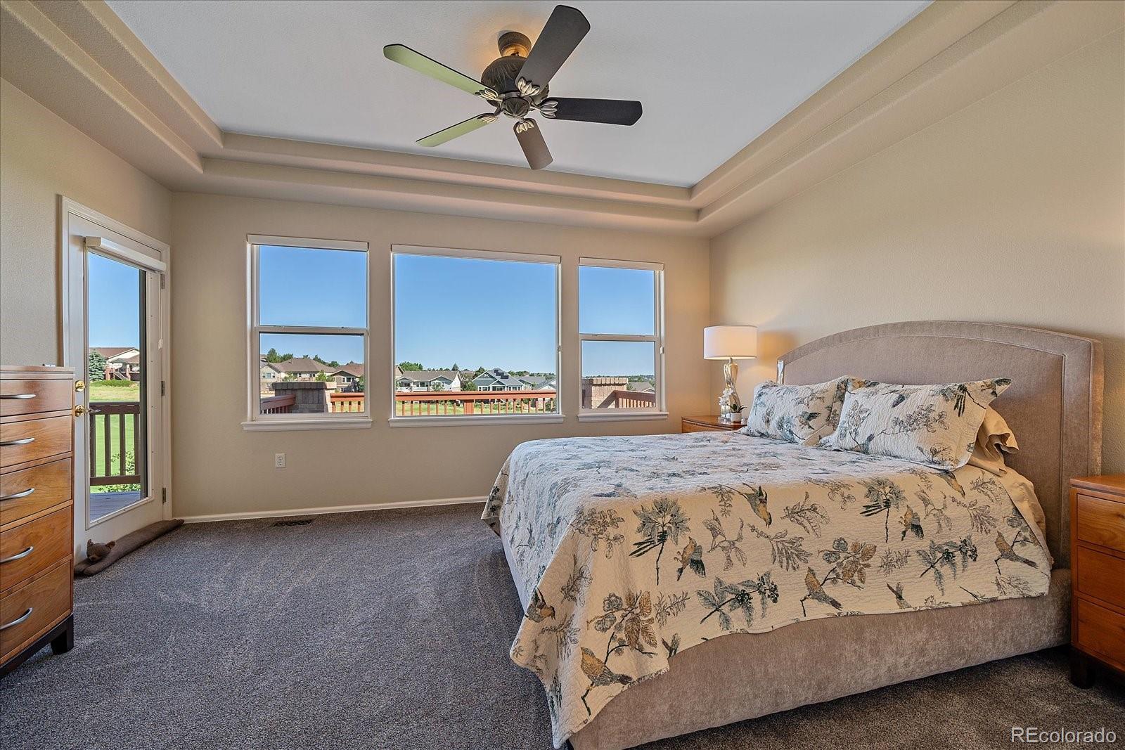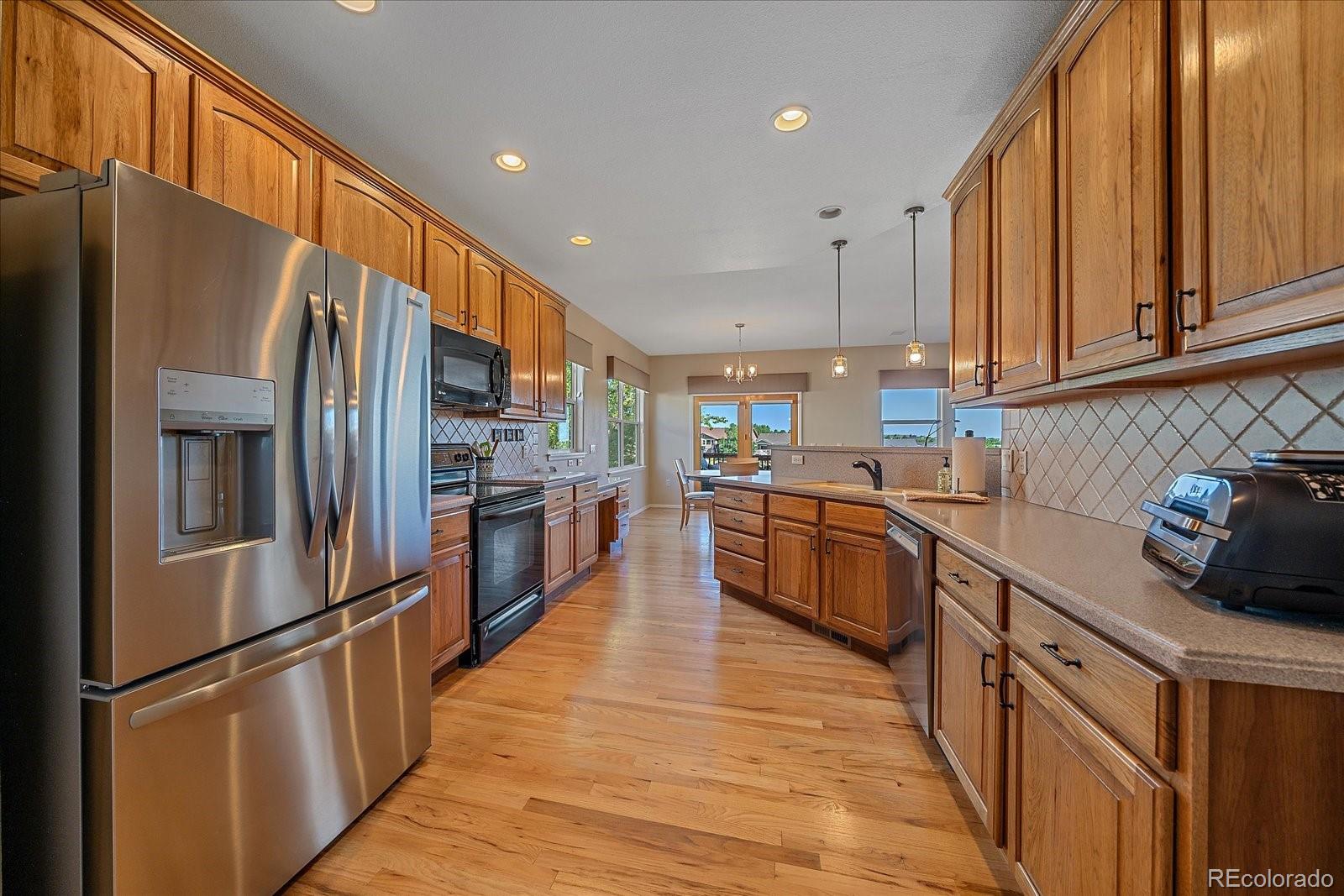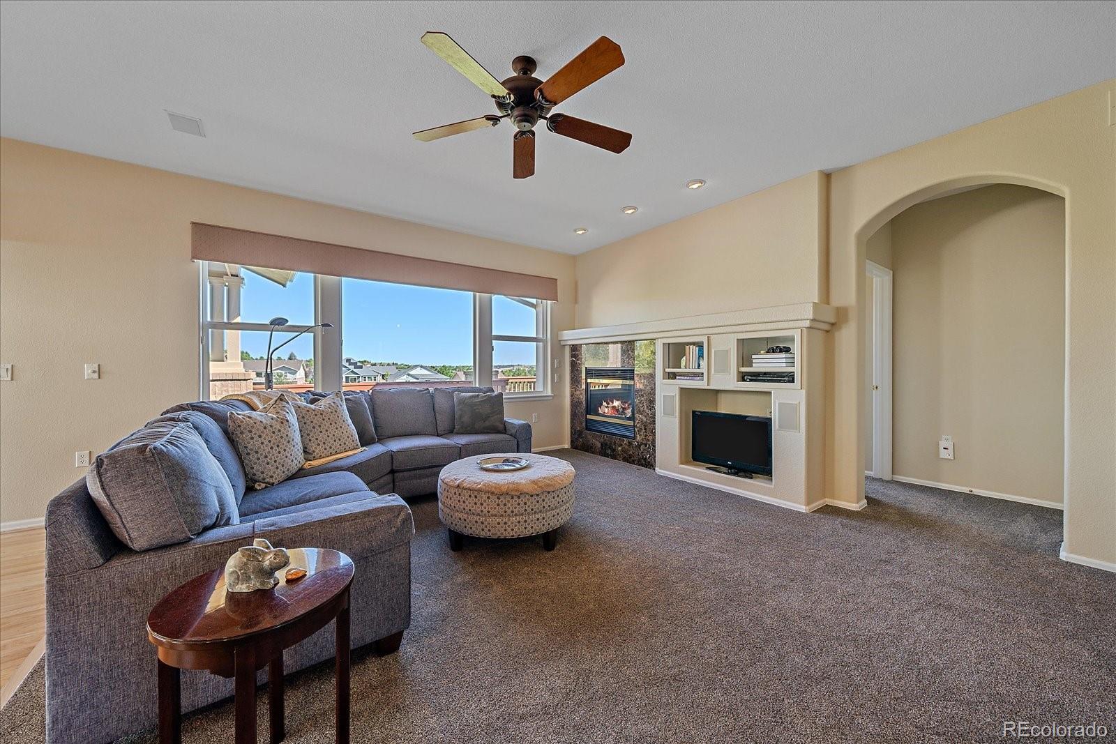 The open-concept main level is ideal for everyday living, while the finished lower level is an entertainer's dream--featuring a full bar with beverage refrigerator, game/poker area, buffet bar, and included surround sound equipment. A spacious guest bedroom and 3/4 bath provide privacy and comfort for visitors. Enjoy stunning sunsets views from the covered back porch or relax on one of the multiple outdoor patios and decks, all while watching golfers tee off just steps away. Retreat to the primary suite, complete with a large walk-in closet, and appreciate the practicality of the oversized 2.5-car garage--perfect for golf carts, storage, or hobbies. Additional highlights include: New Class 4 impact-resistant roof (2024), Rachio smart sprinkler system for effortless lawn care, Located within a premier 45+ golf course community with access to top-tier amenities.